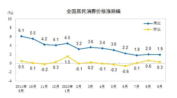 2012年9月份,全國居民消費價格總水平同比上漲1.9%。其中,城市上漲2.0%,農(nóng)村上漲1.7%;食品價格上漲2.5%,非食品價格上漲1.7%;消費品價格上漲1.8%,服務(wù)項目價格上漲2.3%。1-9月平均,全國居民消費價格總水平比去年同期上漲2.8%。